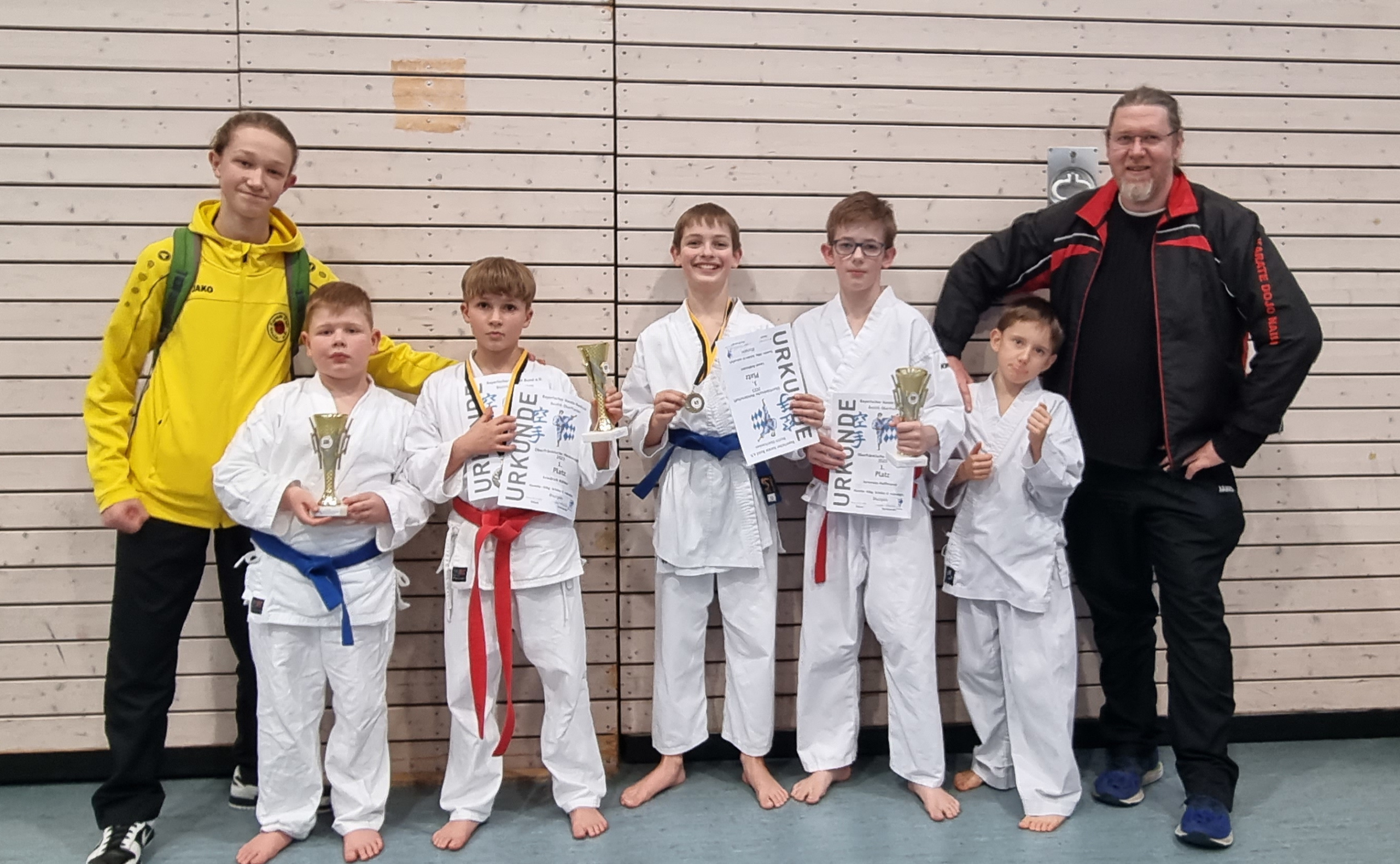 Friedrich Köhler startete anschließend in der Kategorie Schüler Kumite -32kg. Mit einem beeindruckenden Ura-Mawashi (Fusstritt zum Kopf) zu Beginn des Kampfes errang er einen Vorsprung und konnte den Kampf mit 7:2 für sich entscheiden. Auch die weiteren Kämpfe konnte er souverän für sich entscheiden so dass er Bezirksmeister wurde und den Pokal in Empfang nehmen durfte. In der Allkategorie seiner Altersklasse sicherte er sich zusätzlich eine Bronzemedaille.