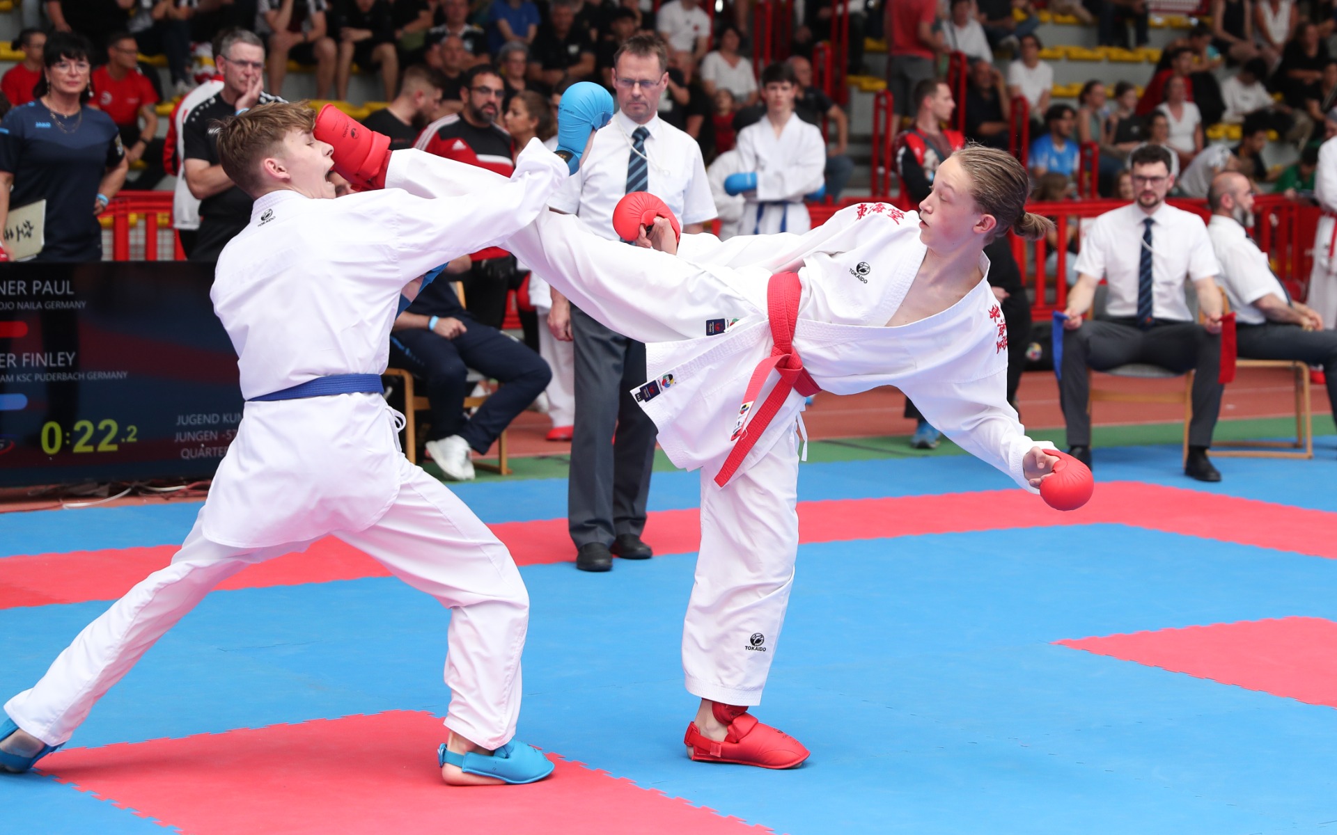 Im Einzel setzte er sich nach 4 Vorkämpfen ohne Punktverlust als Poolsieger durch. Das Finale ging er hochkonzentriert an. Das Abtasten des Gegners war obligatorisch um Schwächen zu finden. Diese nutzte er entscheidungsstark zum 1:0. Danach taktisches Verhalten um die Führung zu halten. Kurz vor Schluss gleicht sein Gegner Denys Kolesnikov von SAIKO KARATE E.V. verdient aus. Nun war wieder alles offen. Weitere Punkte machen oder den Vorteil der ersten Wertung über die Zeit retten. Paul entschied sich für Letzteres und gewann den Kampf und damit die Goldmedaille.
